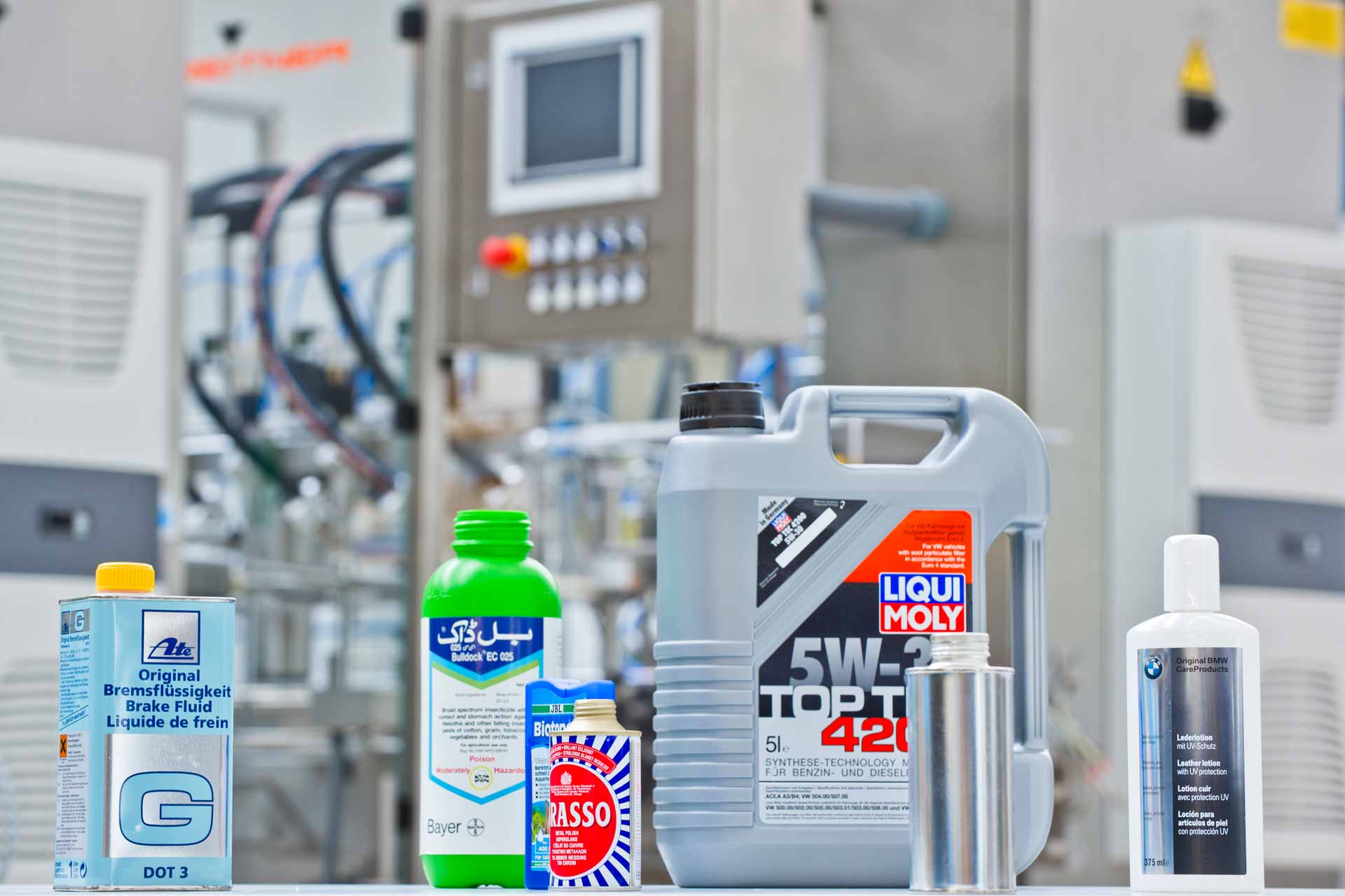 In der chemischen Industrie bedient unser Unternehmen ein breites Spektrum: Unsere Maschinen füllen Flüssigkeiten für die Automobilindustrie, die Reinigungschemie oder die Agrochemie ab, um nur einige zu nennen.