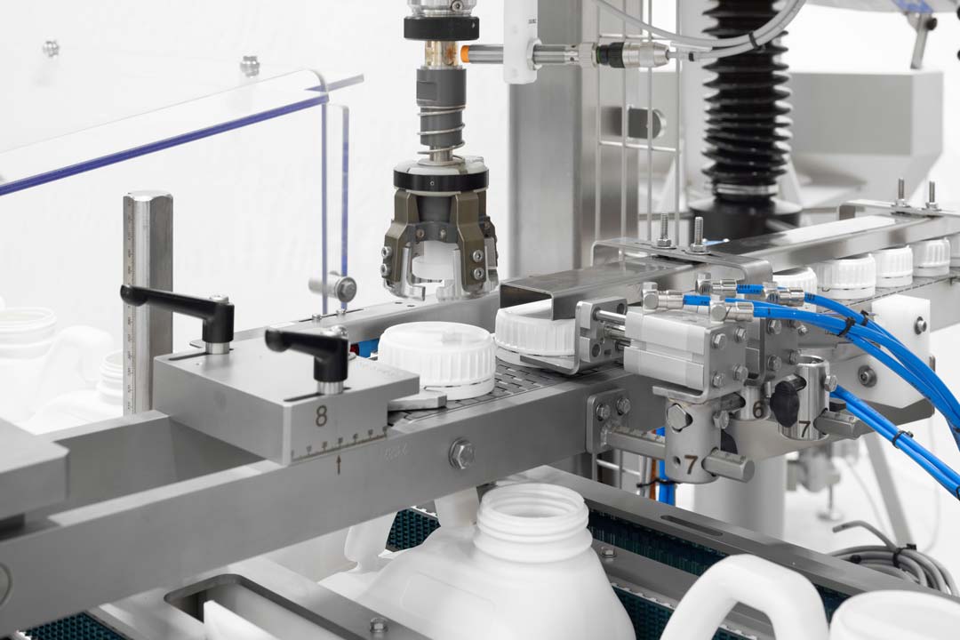 Das mitfahrende Prinzip sorgt für einen besonders ruhigen Verschließprozess – ideal bei Kanistern, da kein Überschwappen entsteht. So bleibt die Befüllung sauber und sicher.